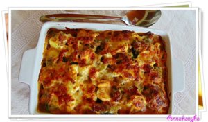 Egy kisebb lábasban megolvasztom a vajat és üvegesre párolom rajta az apróra felkockázott vöröshagymát. Rászórom a lisztet és kicsit lepirítom, majd apránként hozzáöntöm a tejet és a főzővizet. Kevergetve felforralom, majd közepes lángon még pár percig főzöm. A tűzről leveszem és hozzákeverem a reszelt sajtot és a bacont. Ízesítem sóval, borssal.