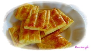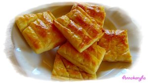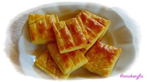 Ujjnyi vastagra kisodrom, a tetejét éles késsel rácsosra bevagdosom, a tojással lekenem, majd négyzetes darabokra vágom. Sütőfóliával bélelt tepsire rakom, és 200 °C-os sütőben aranybarnára sütöm.