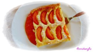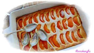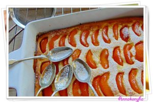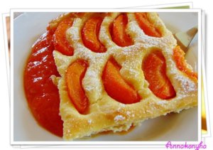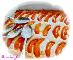 A megmosott, meghámozott és kimagozott barackot cikkekre vágom, és sűrűn kirakom vele a tetejét. rászórom a maradék cukrot, majd rádobálom a maradék vajat. A tetejére szórom a mandulaszeleteket, és 200°C-os sütőben, kb 40 perc alatt készre sütöm.