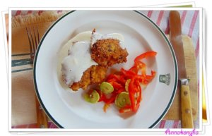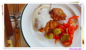 A csirkemellből kb 1 cm-es érméket vágok és fólia közé téve enyhén kiklopfolom. Besózom és állni hagyom.Addig elkészítem a kuszkusz bundát.