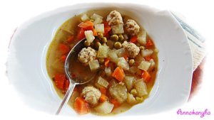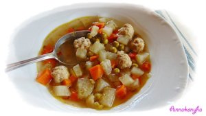 Közben összedolgozom a darált húst a tojással, a vágott snidling kétharmadával, a sóval, a borssal és a zsemlemorzsával. A masszából apró kis gombócokat formázok, a forró levesbe teszem és 25-30 percig főzöm. Vele párhuzamosan hozzáadom a zöldborsót és a maradék snidlinget is.