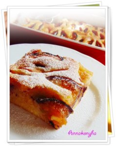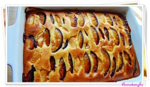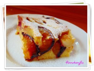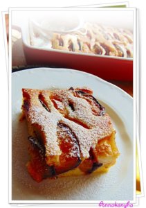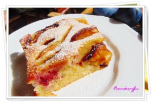 Egy sütőformát kivajazok, a masszát beleöntöm, majd a megtisztított, kimagozott és felszeletelt gyümölccsel a tetejét kirakom, kicsit belenyomkodom.