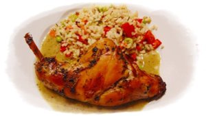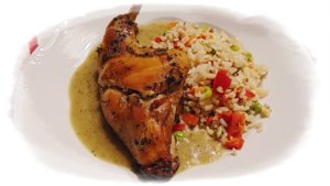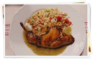 Az olajat összekeverem a citromlével , a felaprított petrezselyemlevéllel, a majoránnával és ráöntöm a nyúlra. Lefedem és a hűtőbe teszem pár órára.