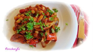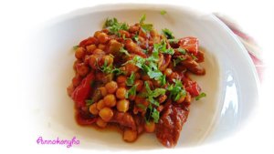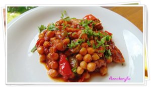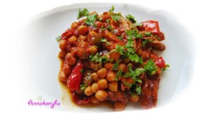 A húst ismét kiszedem, a csicseriborsót a serpenyőbe teszem, és 5 percig erős lángon forralom.