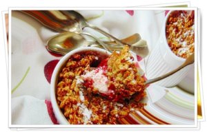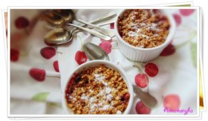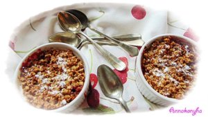 A zabpelyhet a zabliszttel, a szódabikarbónával, 1tk cukorral, és az olvasztott vajjal elmorzsolom, majd a gyümölcsök tetejére szórom.