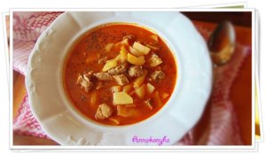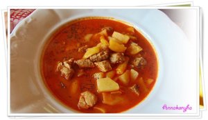 A felkockázott vöröshagymát kevés olajon üvegesre párolom, majd ráteszem a felkockázott húst, és fehéredésig sütöm. A tűzről lehúzom megpaprikázom, elkeverem, majd felöntöm vízzel. Visszateszem a tűzre, sózom, borsozom, ízesítem a babérlevéllel és a köménnyel.