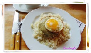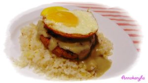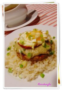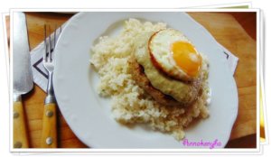 A tányérokra halmozom a rizst, a tetejére illesztem a húspogácsát, nyakon öntöm a hagymamártással, majd megkoronázom a tojással. A felkarikázott újhagymával díszítem.