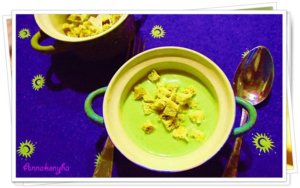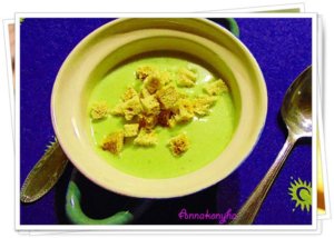 A levest a ropogós kenyérkockákkal tálalom.