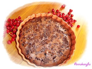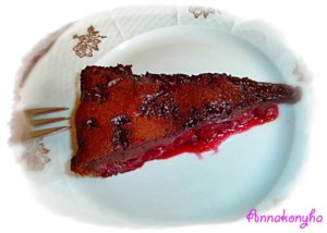 A 23-24 cm átmérőjű piteformát kivajazok és kilisztezek. A kimagozott meggyet az aljába egy rétegben elterítem, majd a kakaós masszát ráöntöm. A tetejére rászórom az összeaprított étcsokoládét.