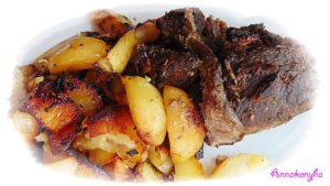 A megtisztított burgonyát hosszában negyedelem, megsózom, rozmaring levelekkel gazdagon megszórom, majd olajjal meglocsolom és összeforgatom. Egy sütőzacskóba zárom, a zacskó tetejét megböködöm, hogy a gőz távozni tudjon, majd egy sütőtála teszem és majd a hússal együtt a sütőbe helyezem.