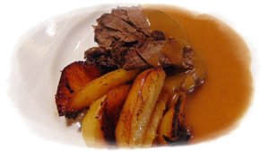 Egy kisebb edénybe teszem a leöntött szaftot, botmixerrel pépesítem, majd egy szűrőn átszűröm, hogy teljesen sima, krémes öntetet kapjak. Visszateszem a tűzre, fehérborral hígítom, és ha nem elég sűrű egy evőkanálnyi keményítőt kikeverek egy kevés vízzel és besűrítem a mártást. Egyet forralok rajta, és a felszeletelt sült szarvascombra öntve, a sült burgonyával tálalom.